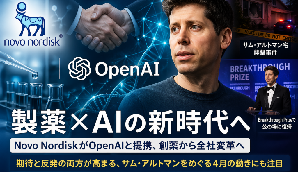 Novo NordiskとOpenAIの提携は、AIの産業実装が次の段階に進んだことを示すニュースです。製薬という高規制・高専門性の分野で、AIが創薬から事業運営まで入り込もうとしている点は大きな意味があります。そして、その中心人物であるサム・アルトマンをめぐっては、称賛と反発が同時に強まっています。今回の話は、OpenAIの事業拡大を伝えるだけでなく、AIが社会のど真ん中に入ってきた時代の空気感まで映し出していると言えそうです。